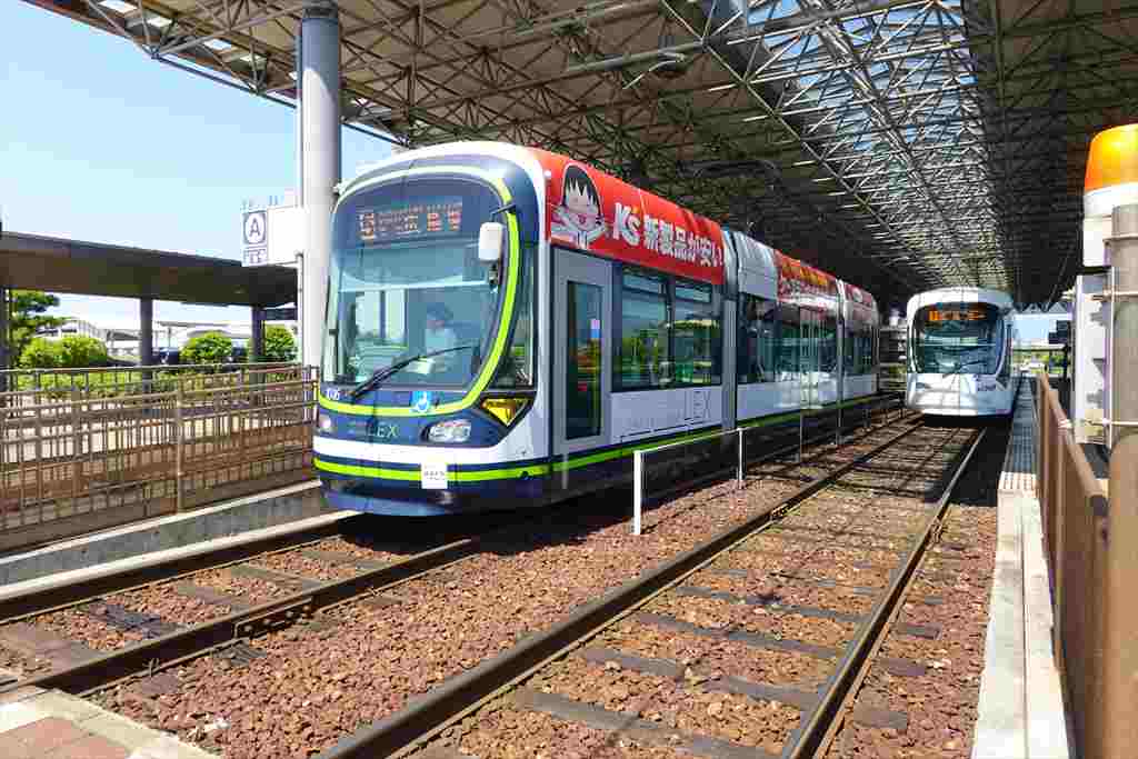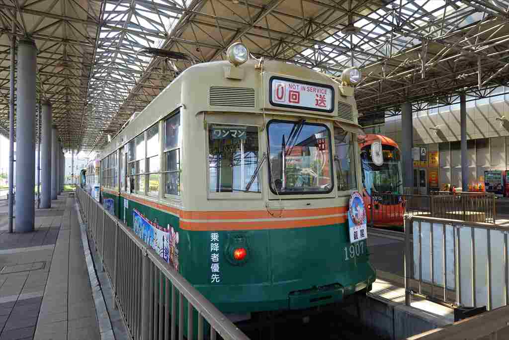 路面電車のホームと直結している。ガラス戸の向こうは海。