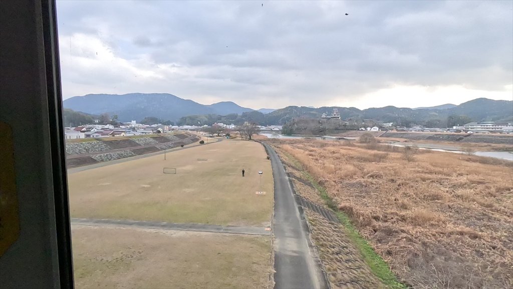 少し行くと右手に見えてきたのは肱川の土手だ。鉄道が低いところを走っているので、川の横を走っているのに川が見えない。