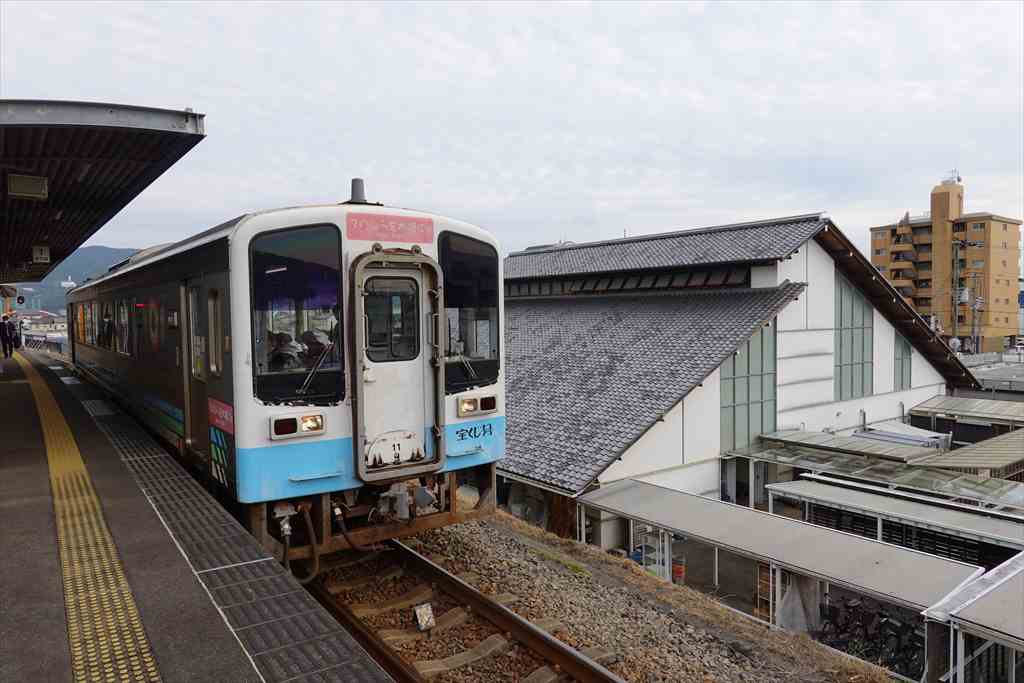 安芸で降りた列車はここで4分停車の後、快速となって高知を目指す。右の大きな建物が安芸駅の駅舎。